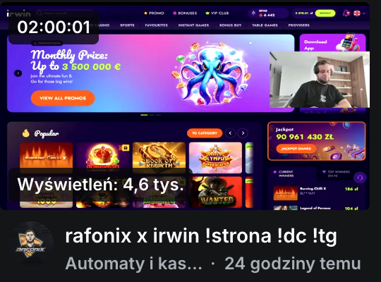 - Streamer hazardowy – Rafonix zdobył popularność dzięki transmisjom na żywo, w których gra w automaty online, ruletkę i blackjacka, często na wysokie stawki.